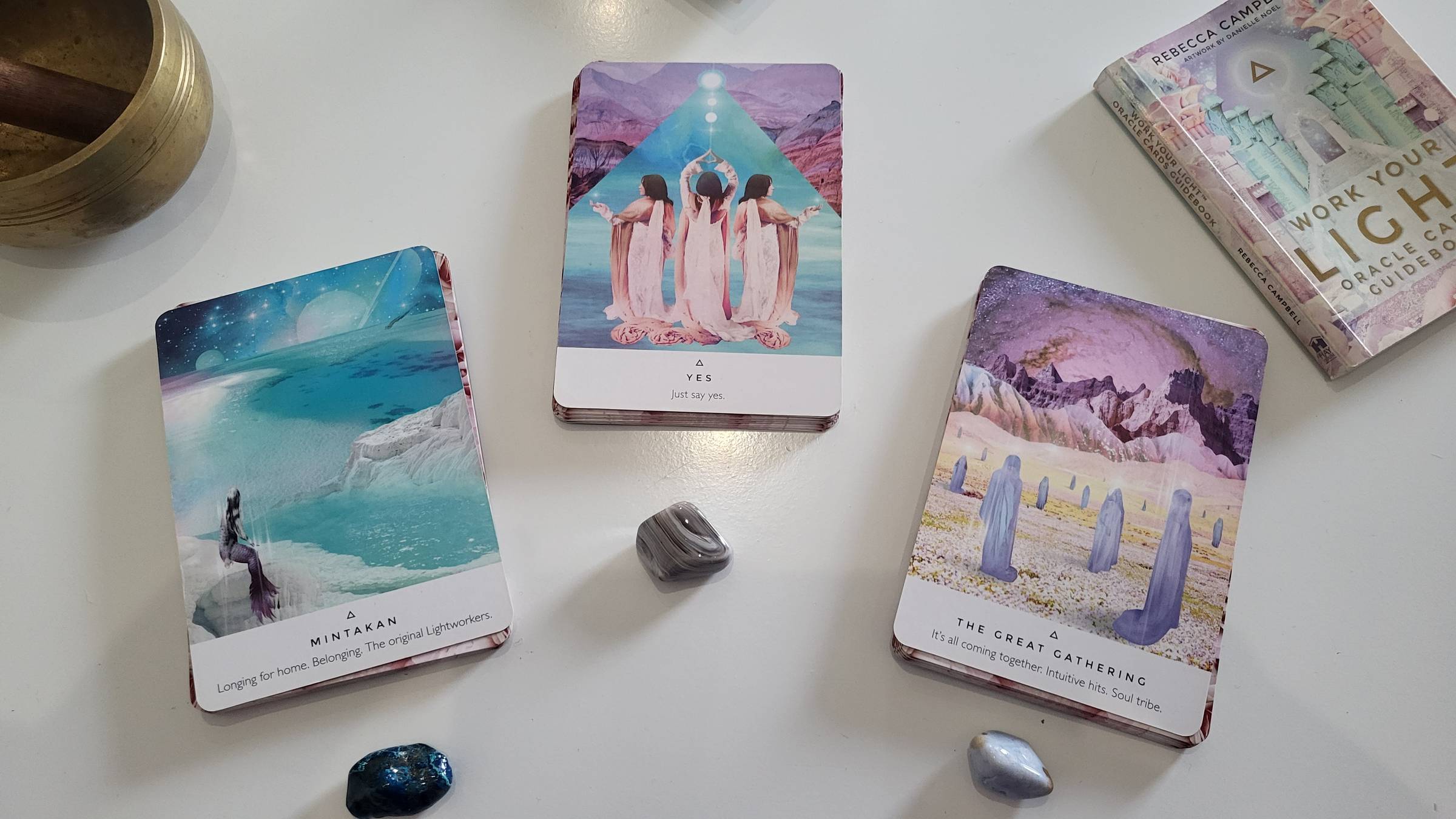 For this week's guidance reading, I'm using Rebecca Campbell's Work Your Light Oracle Deck with a direct translation from the guidebook. If you have a question, feel free to pause and focus on it. Then, look at the stack of cards below and choose one you feel has your reading. Or you can combine the messages of all three cards, and even try applying one of the tarot spreads I shared earlier, to let that be your guidance.